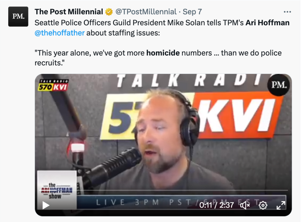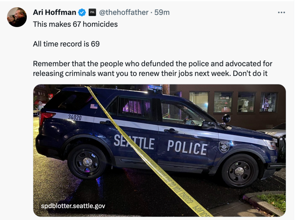 As KVI 570 radio host Ari Hoffman, writing at the Post Millennial, reported, “The FBI recommends the average officer-to-resident ratio for… Seattle as 2.6 per 1,000 residents.” Seattle has 1.3 or half that recommendation. Imagine having to do anything you do in life with half the people. Hoffman has also said, “nearly 600 officers have fled the department….” And it’s no secret SPD’s hiring is in the crapper. And even if 344 is accurate, even that would be a significant shortage.