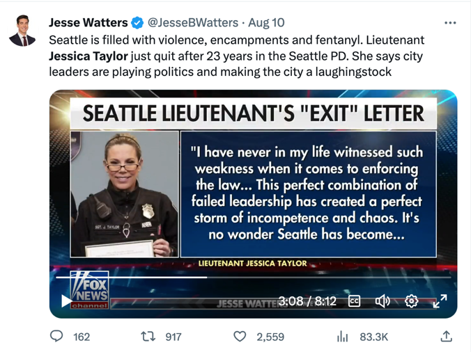“It’s been a free fall into anarchy & chaos,” with Seattle being a “playground for anarchists and criminals…,” and noted a city council seemingly unconcerned while criminals run the city. Taylor said the poor leadership has left Seattle the laughingstock of the nation and world, with leaders choosing political correctness over public safety.