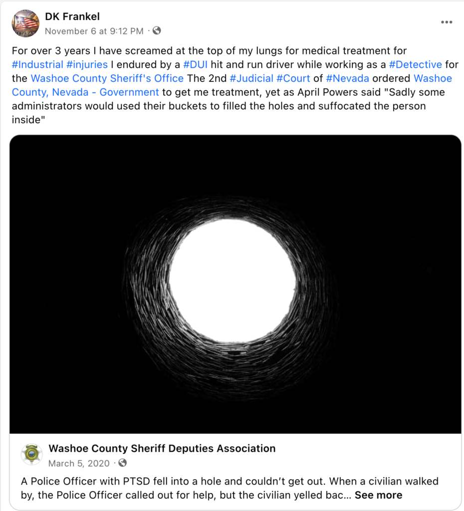 “The legislation, sponsored by state Sen. Skip Daly, D-Sparks, is the brainchild of former Washoe County sheriff’s Detective Kim Frankel who, like Varty, was injured on-duty…. She [Kim] won her case, but the third-party administrator is still denying her treatment.”
