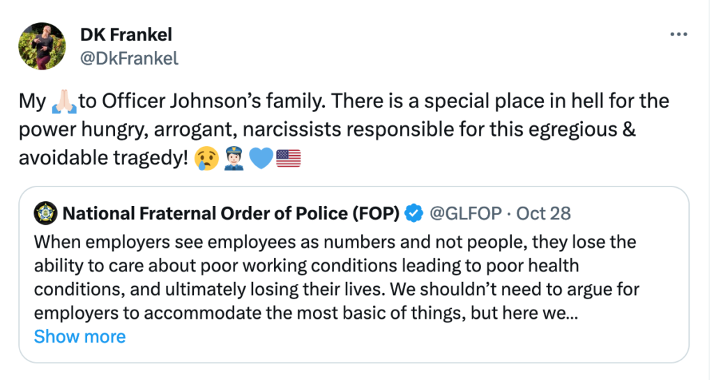 First, I want readers to understand that when I use critical or disparaging language toward the assclowns (like that) involved in this pathetic treatment of an honorable cop, that’s all me, not Kim. Repeatedly, when I’ve asked Kim about the callous people involved, she shows grace even to those who don’t deserve it.