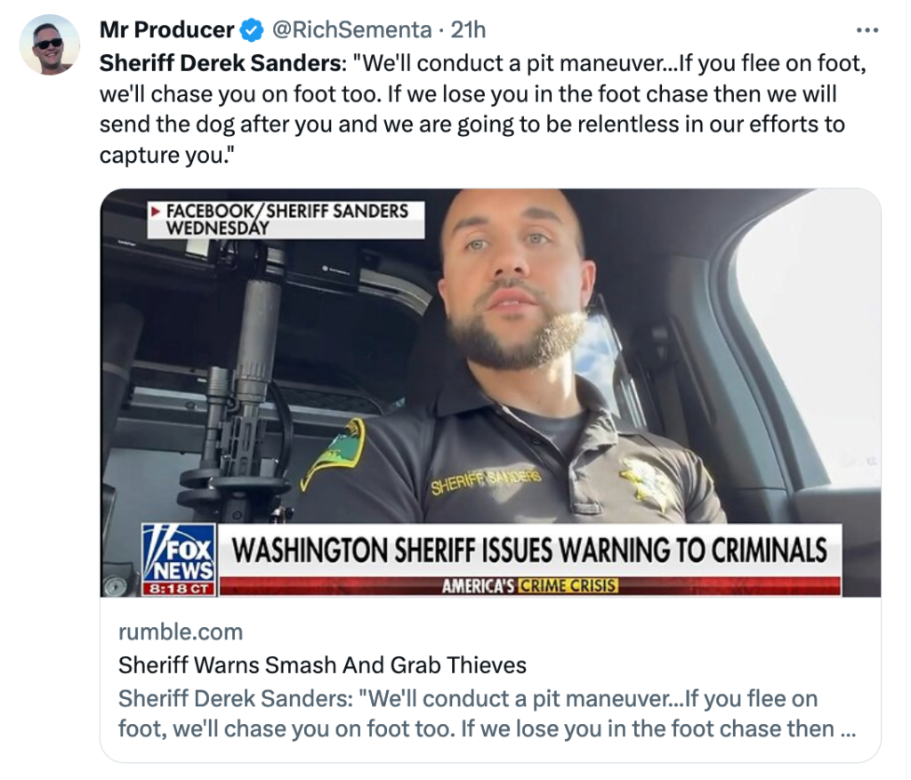 On Rumble, Sheriff Sanders tells bad guys, “We’ll conduct a pit maneuver…If you flee on foot, we’ll chase you on foot too. If we lose you in the foot chase then we will send the dog after you and we are going to be relentless in our efforts to capture you.”